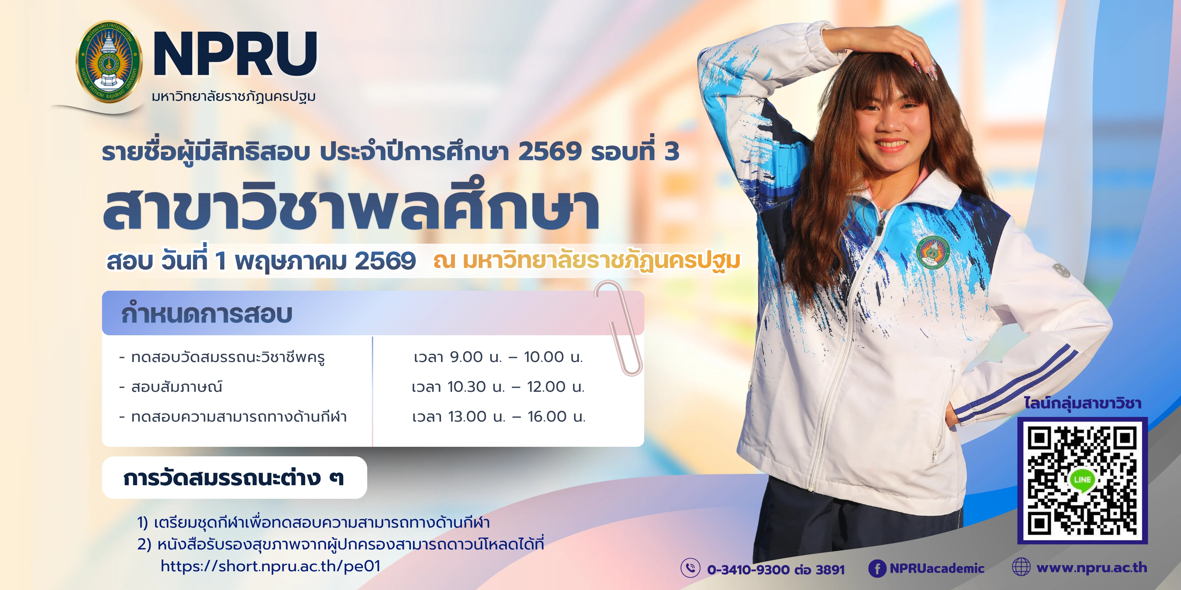 ประกาศรายชื่อผู้มีสิทธิ์สอบ ระดับปริญญาตรี ภาคปกติ ประจำปีการศึกษา 2569 รอบที่ 3 (สาขาวิชาพลศึกษา)